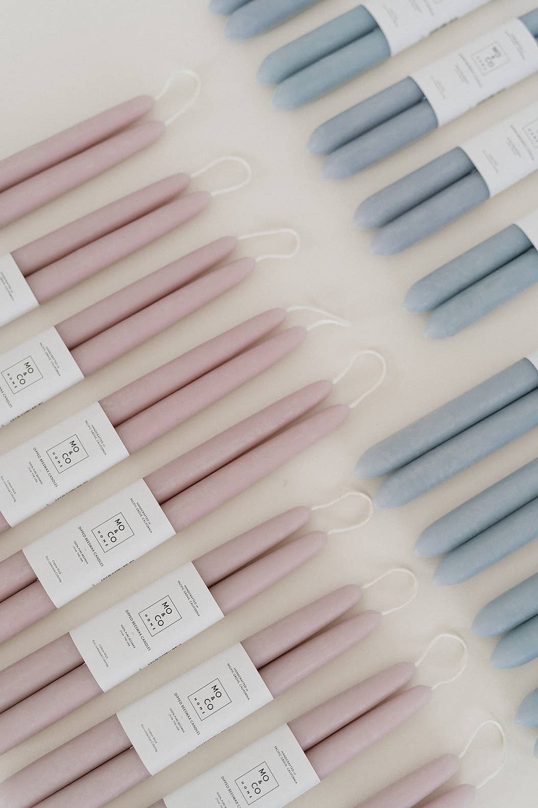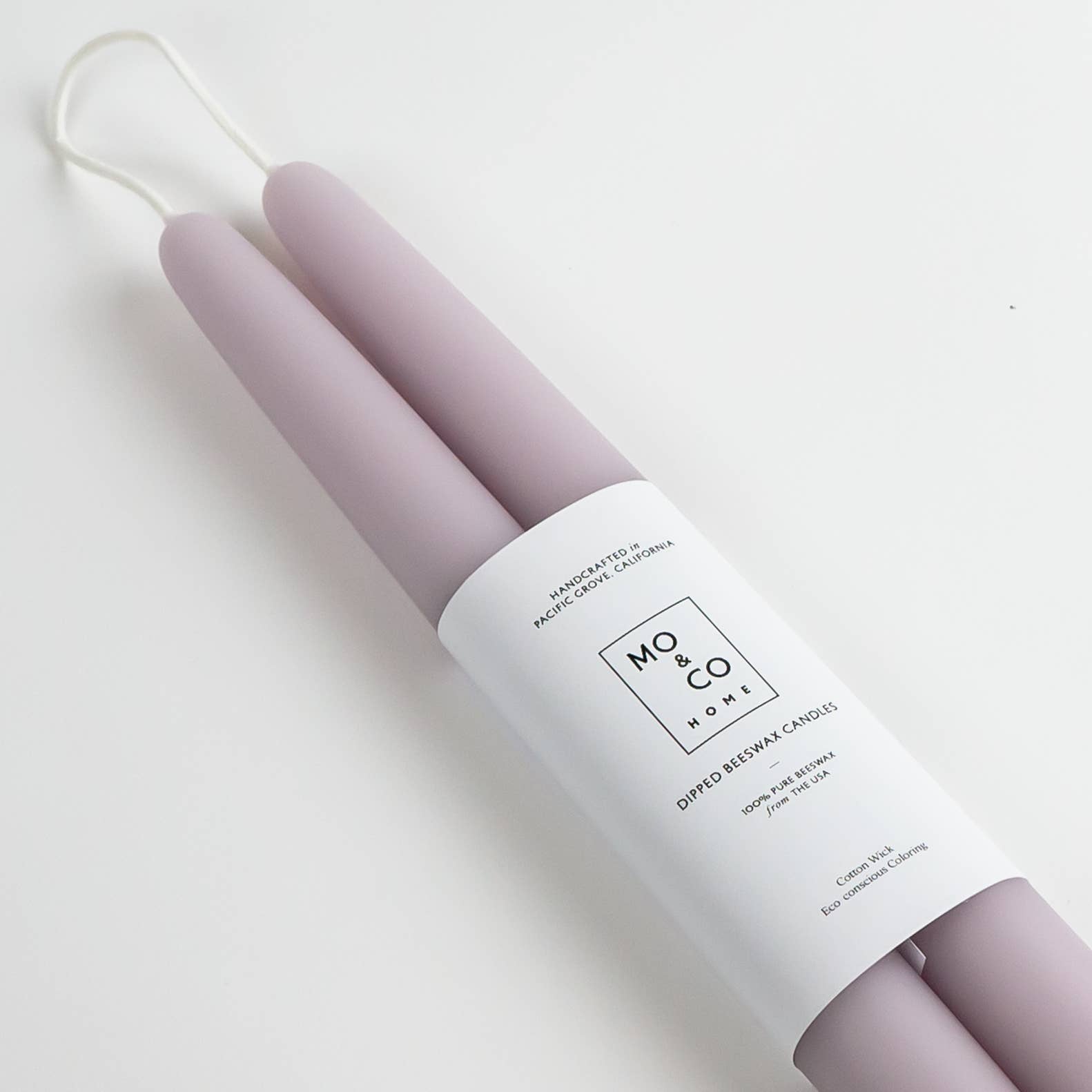 Each beeswax candle is handcrafted with care and dipped over 25 times. Each candle is 10 inches long, sold in pairs. Lavender is our signature soft purple.