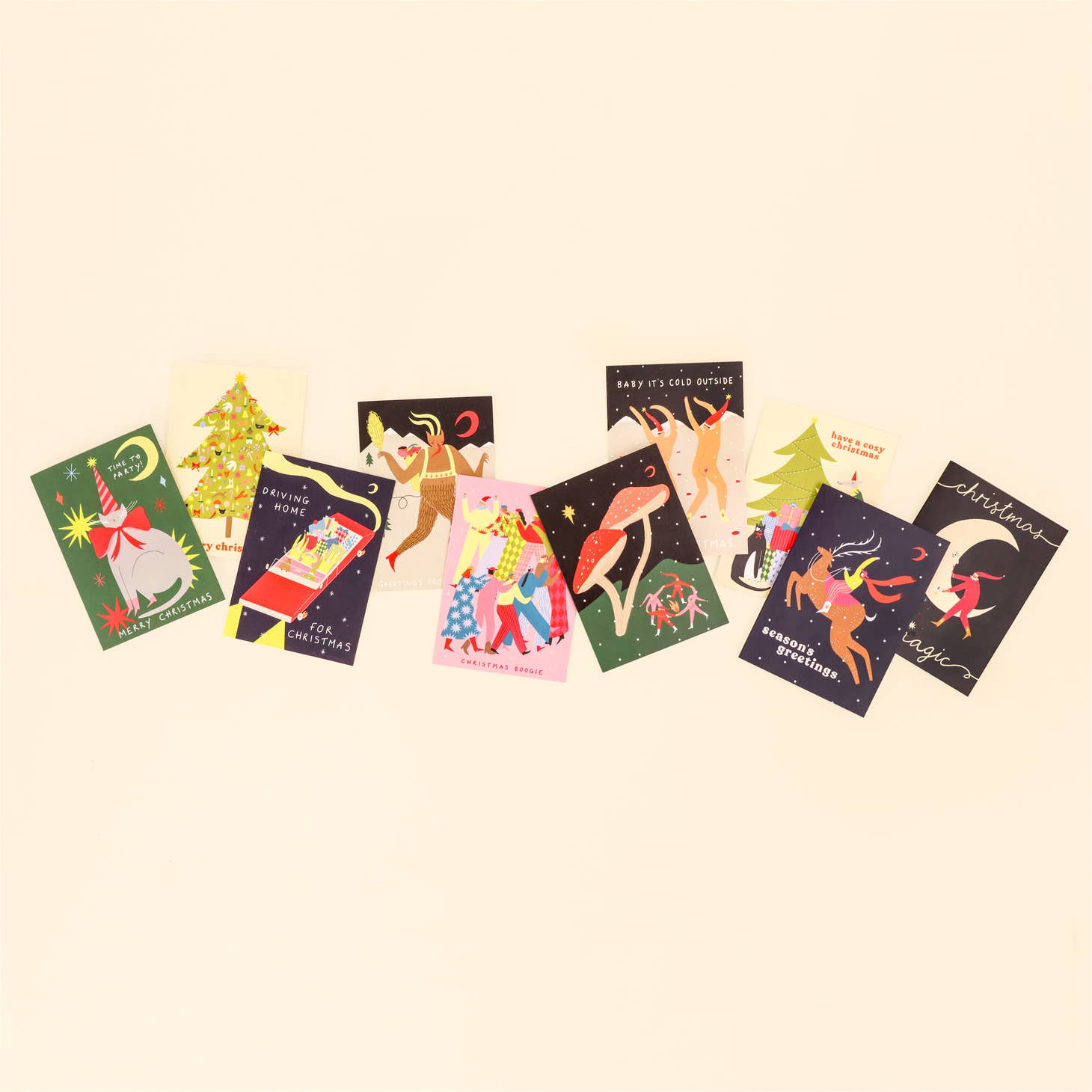 These greeting cards are illustrated by Sarah Wilson for Little Black Cat Illustrated Goods, a UK based brand. The designs showcase the brand's playful artwork style, which is can be seen throughout their collection of unique greeting cards and art prints. The cards are printed on thick 100% recyclable paper with a stunning shimmered finish, adding an extra touch of luxury.