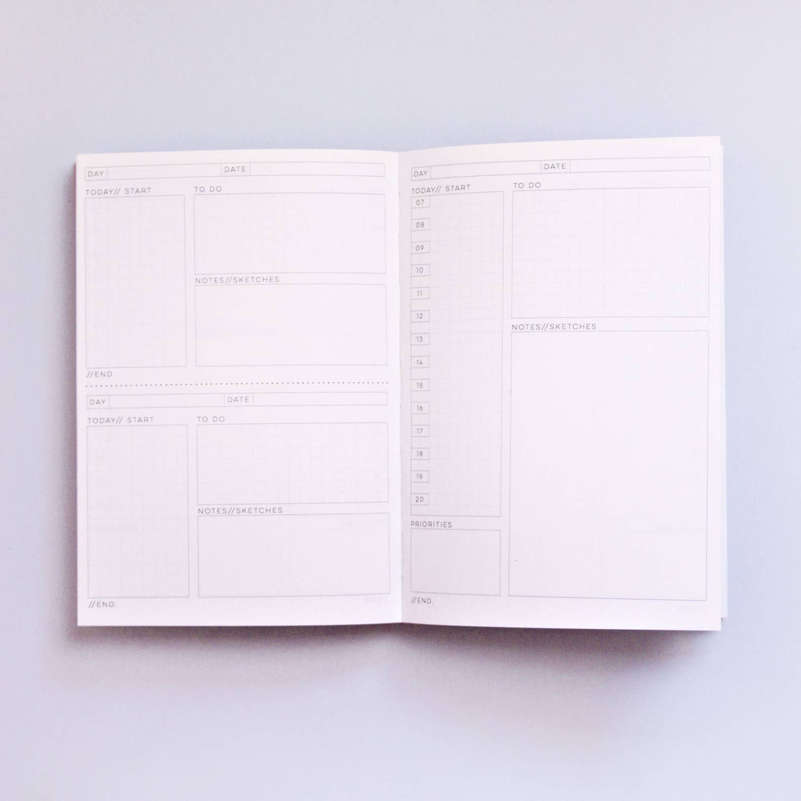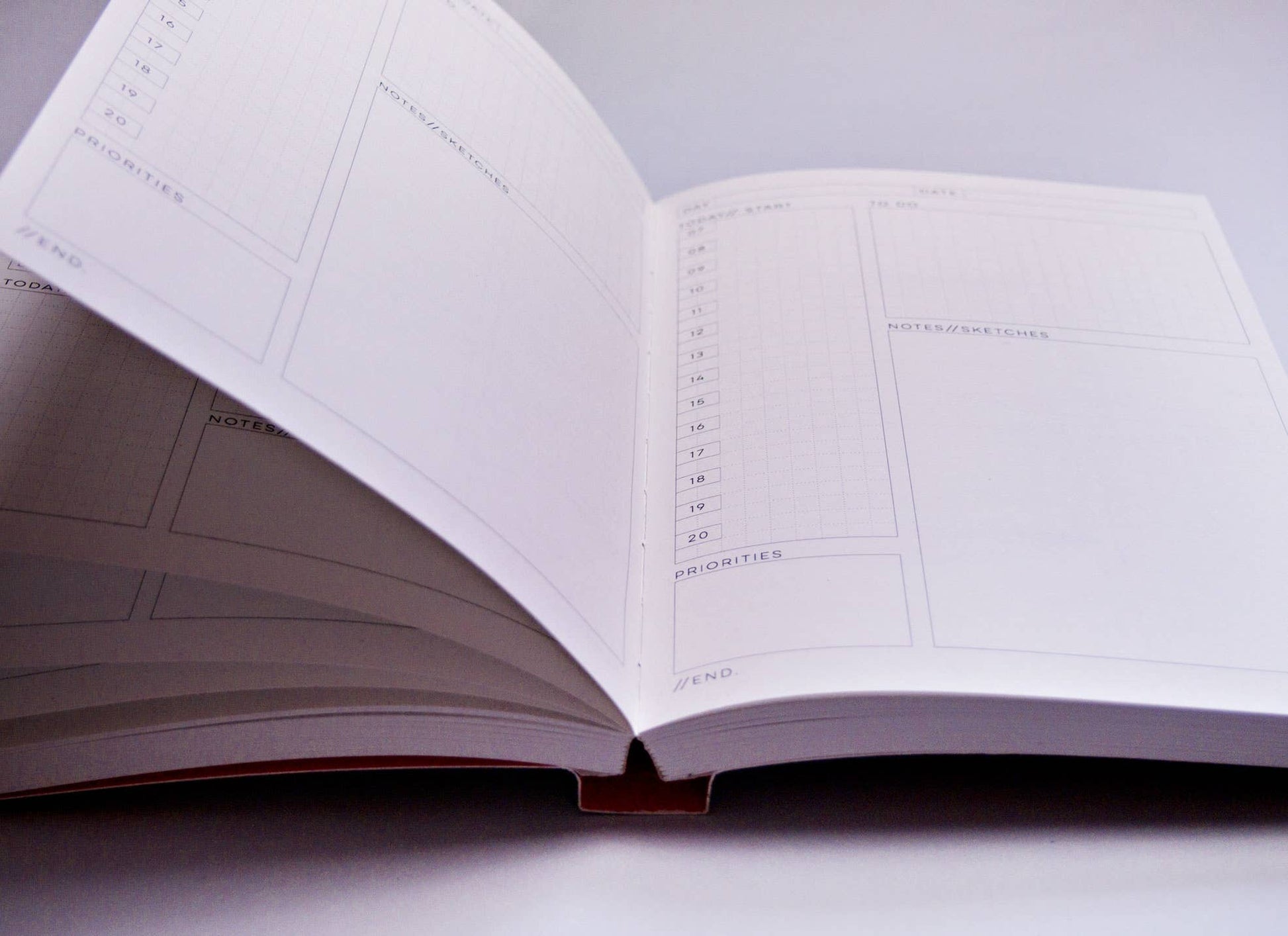 This is a 320 page undated layflat daily planner. It has a day per page for week days, and a day for the weekend - there's 52 weeks in total and it comes with a matching bookmark.