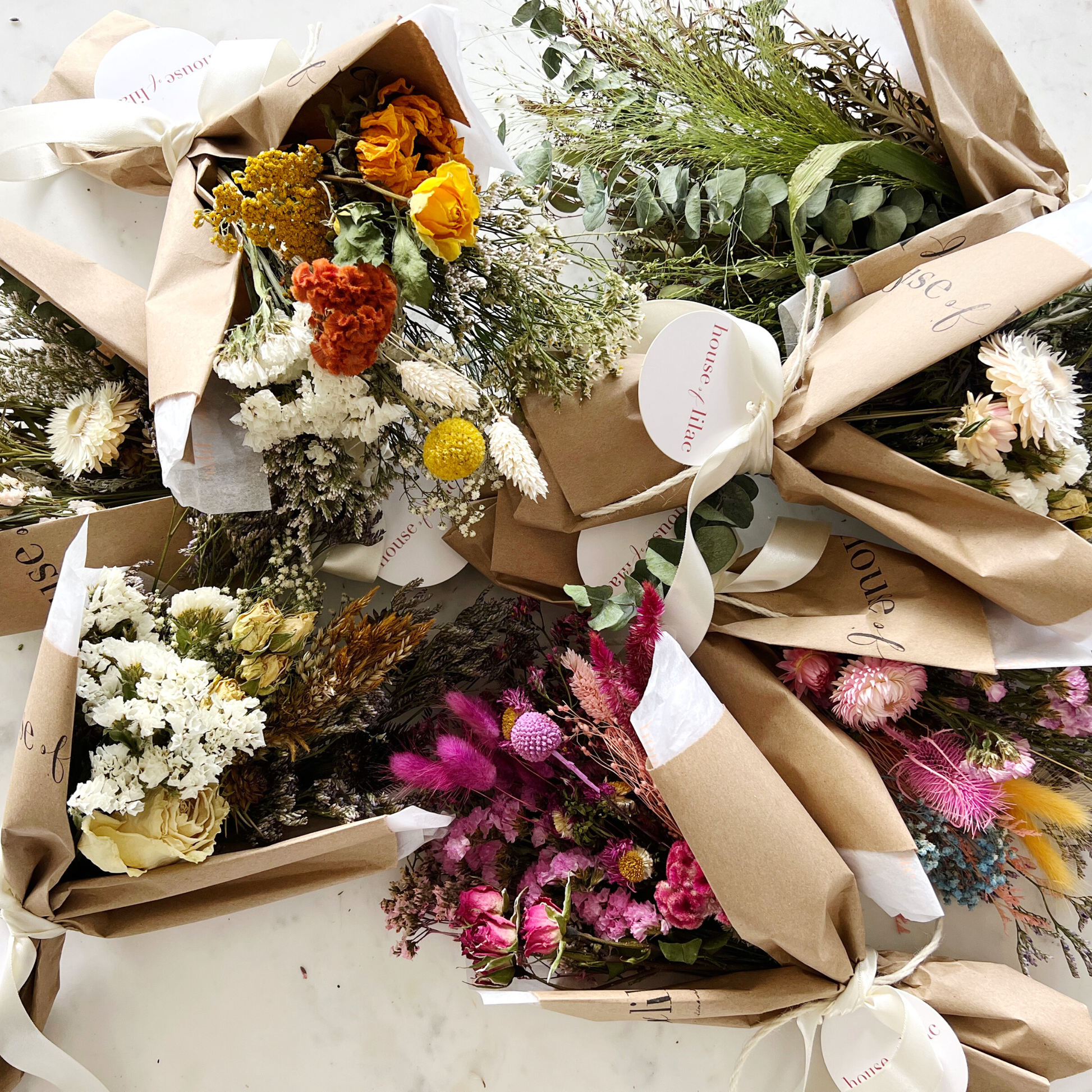 Hello home decor! This dried flower bouquet size is perfect for a small vase at home. Our chic petit dried flower bouquet wrap comes wrapped in our signature kraft paper in five different color stories and is the perfect mix of dried flowers, preserved flowers, and textures.