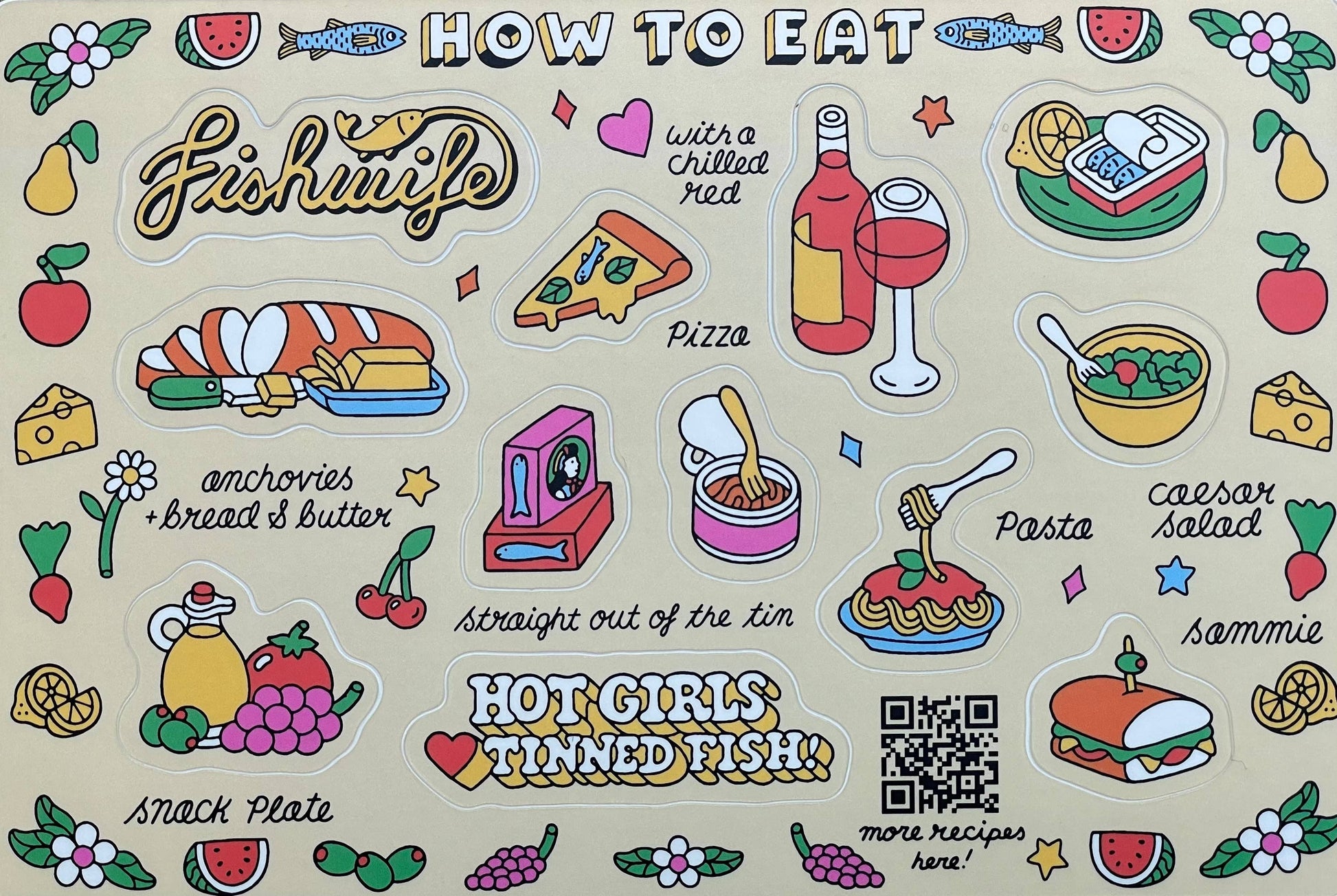"How to Eat Fishwife" sticker sheets. Each sheet has a series of food pairings in the form of peel-away stickers. 4" x 6"