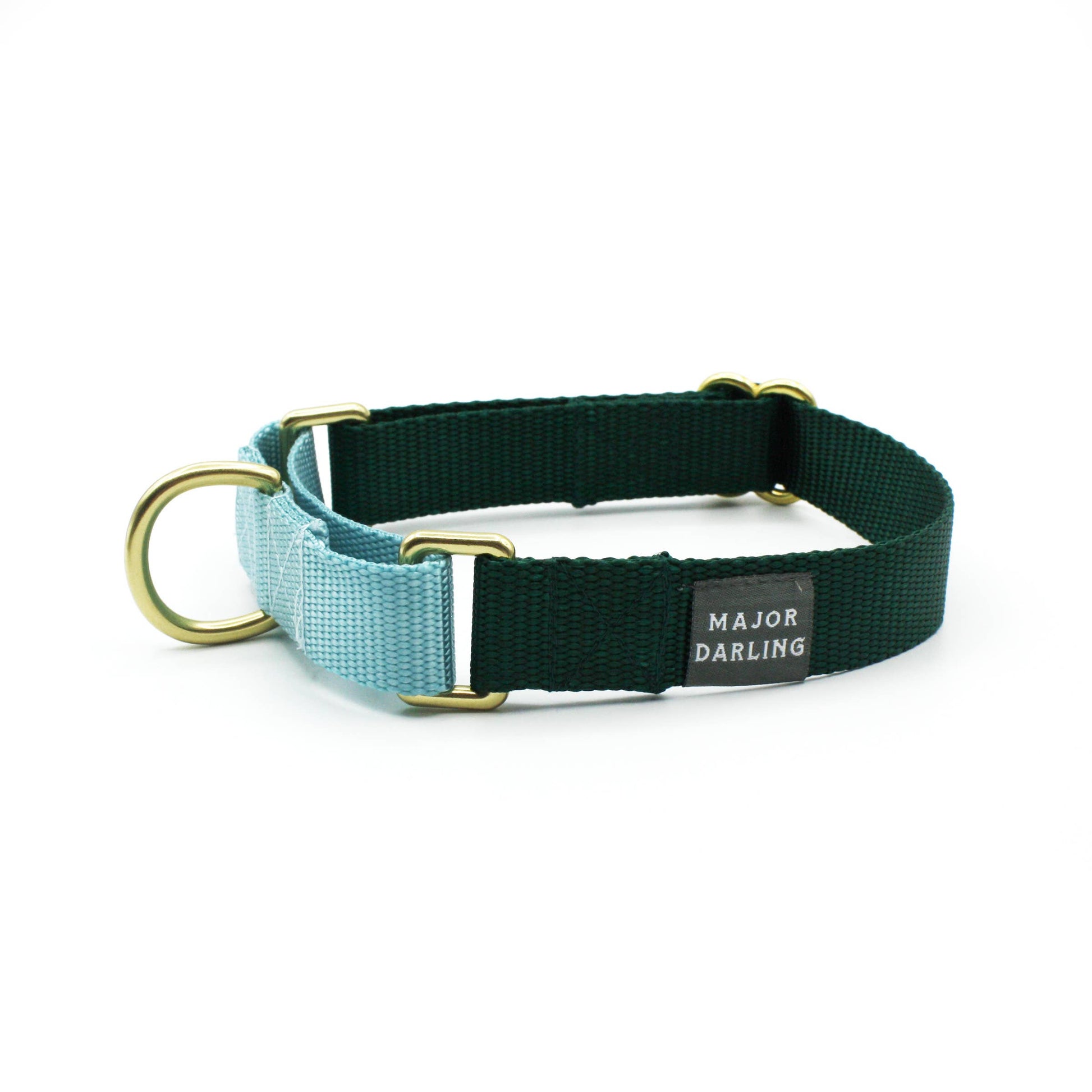 Sturdy nylon webbing and brass hardware make a fashionable duo in our classic martingale style collar. Martingale collars fit loosely on the neck but tighten when pulled, providing more comfort for your dog and more control for you. Made in the U.S.