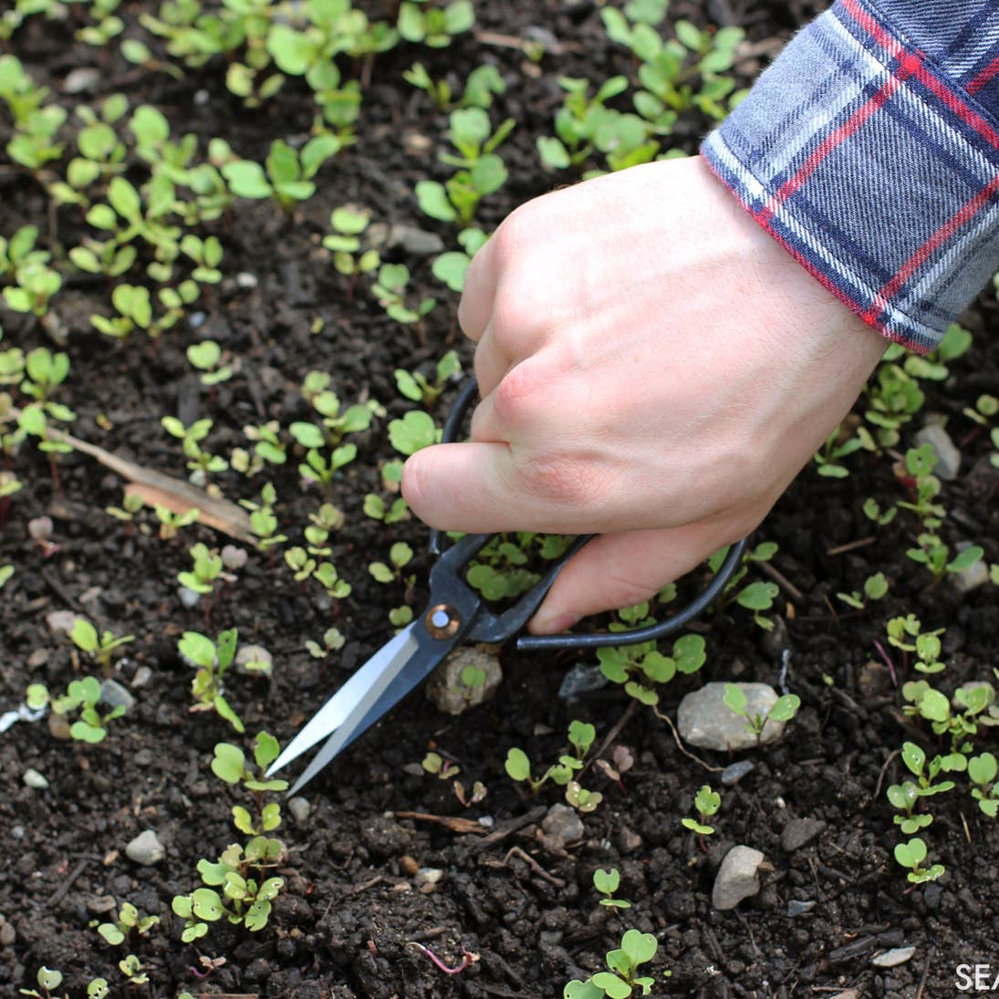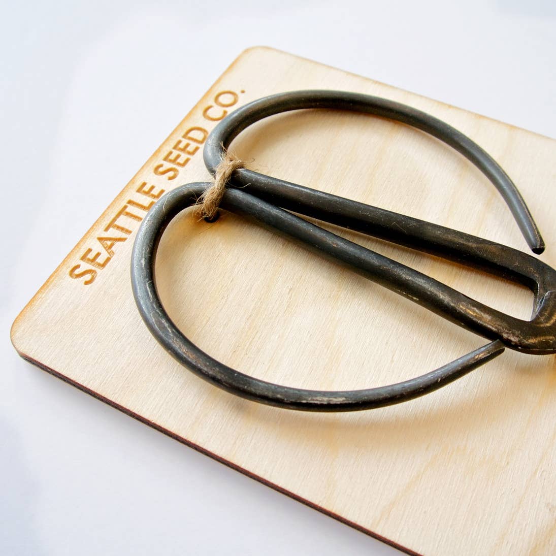 These forged carbon steel utility shears can be used in the garden, kitchen, office or studio. Chinese craftsmen originally created these as bonsai scissors hundreds of years ago. Thanks to their simple yet useful symmetrical design, they can be used by both right and left handed craftspeople. Although they were traditionally known for pruning small shrubs, we have found they are useful for nearly every task, including cutting weed cloth, harvesting herbs and flowers, and cutting twine.