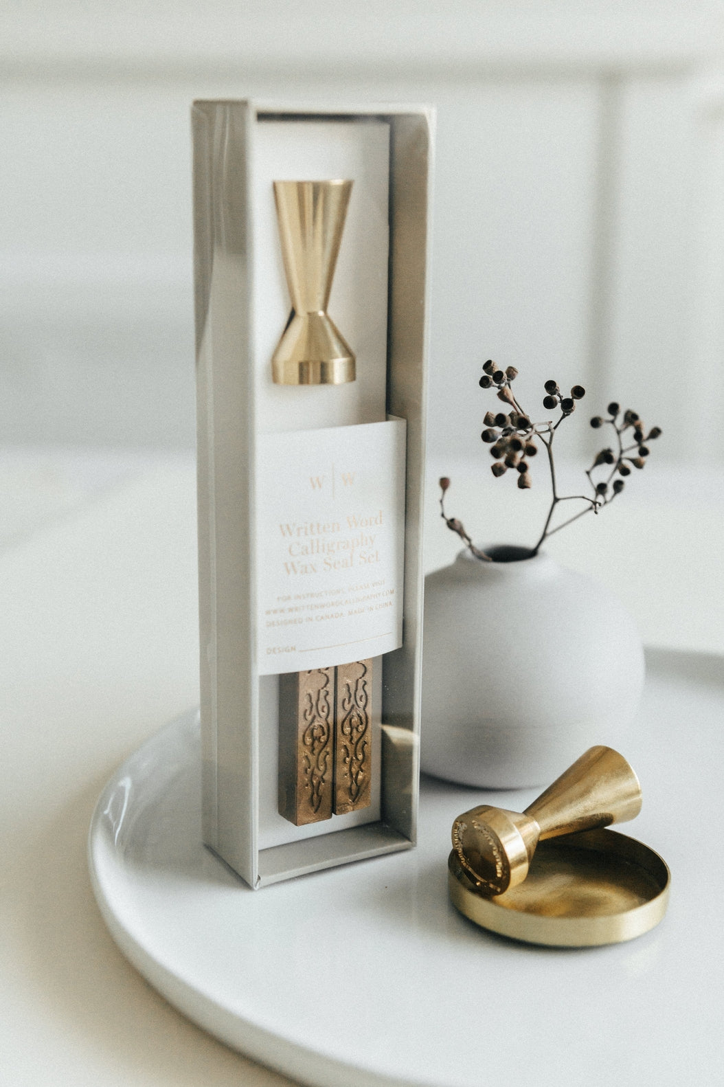 The wax seal set comes in a modern taupe box with a mid-century modern brass seal engraved with an original botanical crest design, and two gold wax seal sticks.
