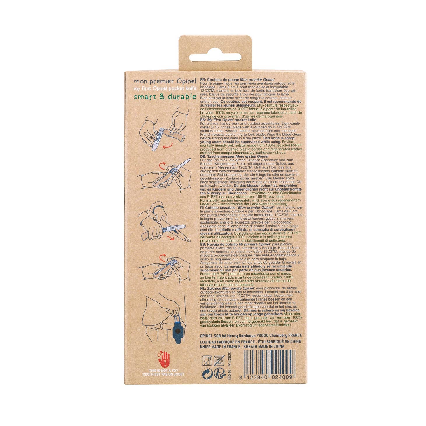 Educate and empower kids with our My First Opinel folding knife and a PET Recycled Sheath. Great for picnics, whittling and outdoor adventures, the knife feature a 3.15'' blunted stainless steel blade and a beechwood handle from sustainably managed French forests. The knife folds and lock in open and closed position for extra safety.