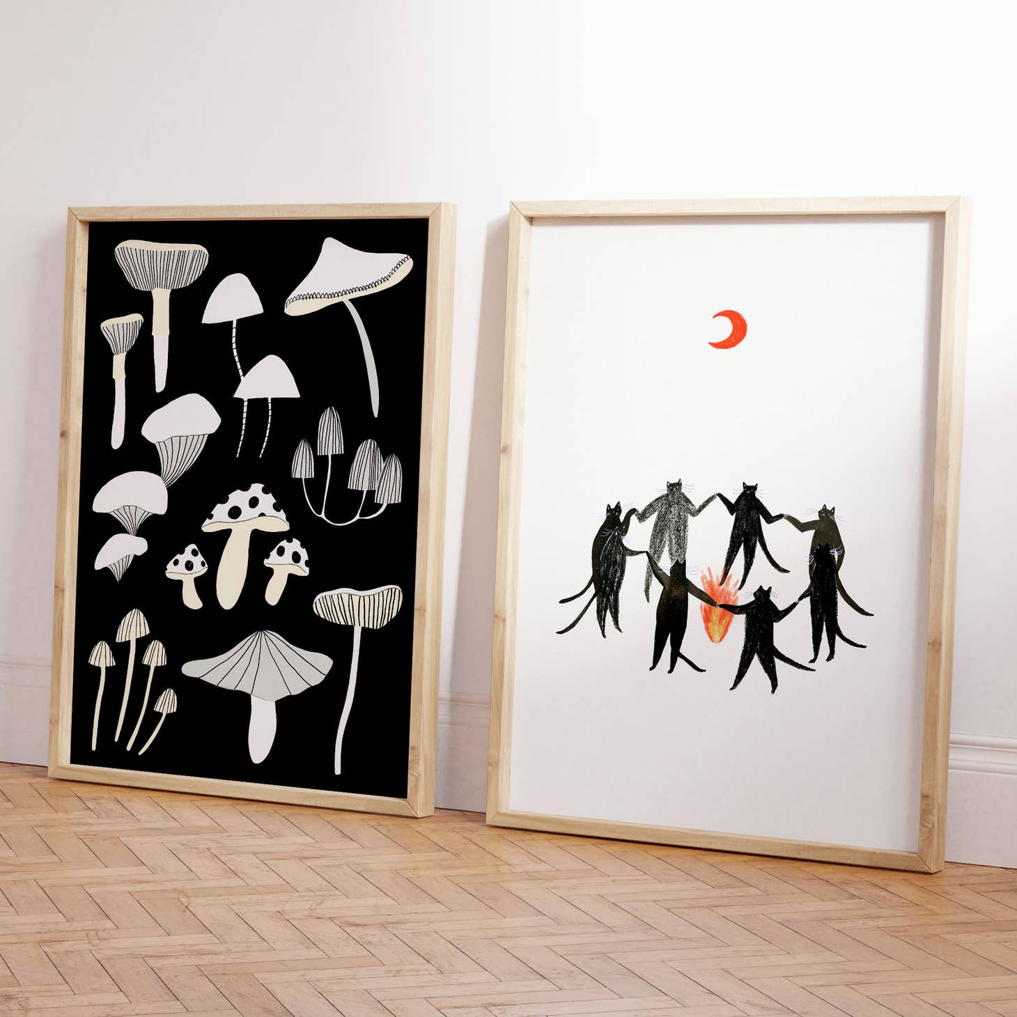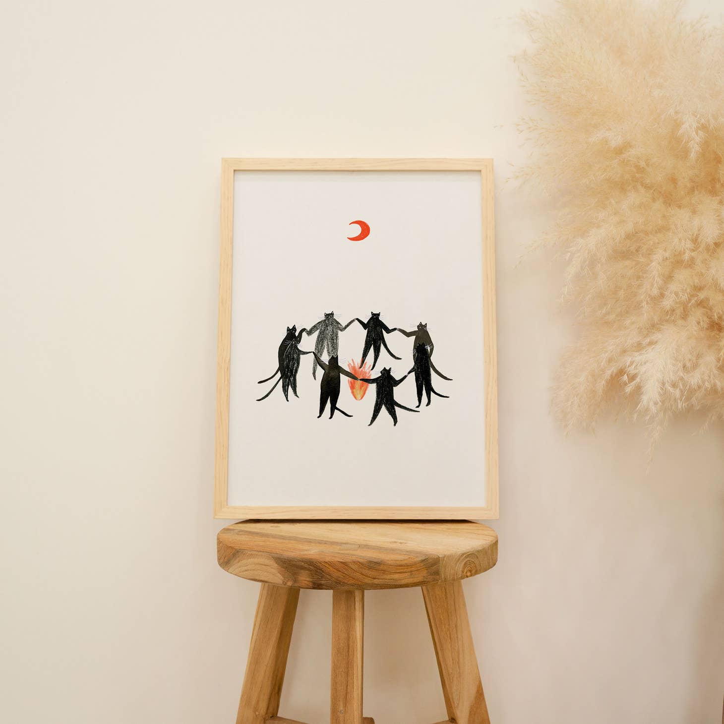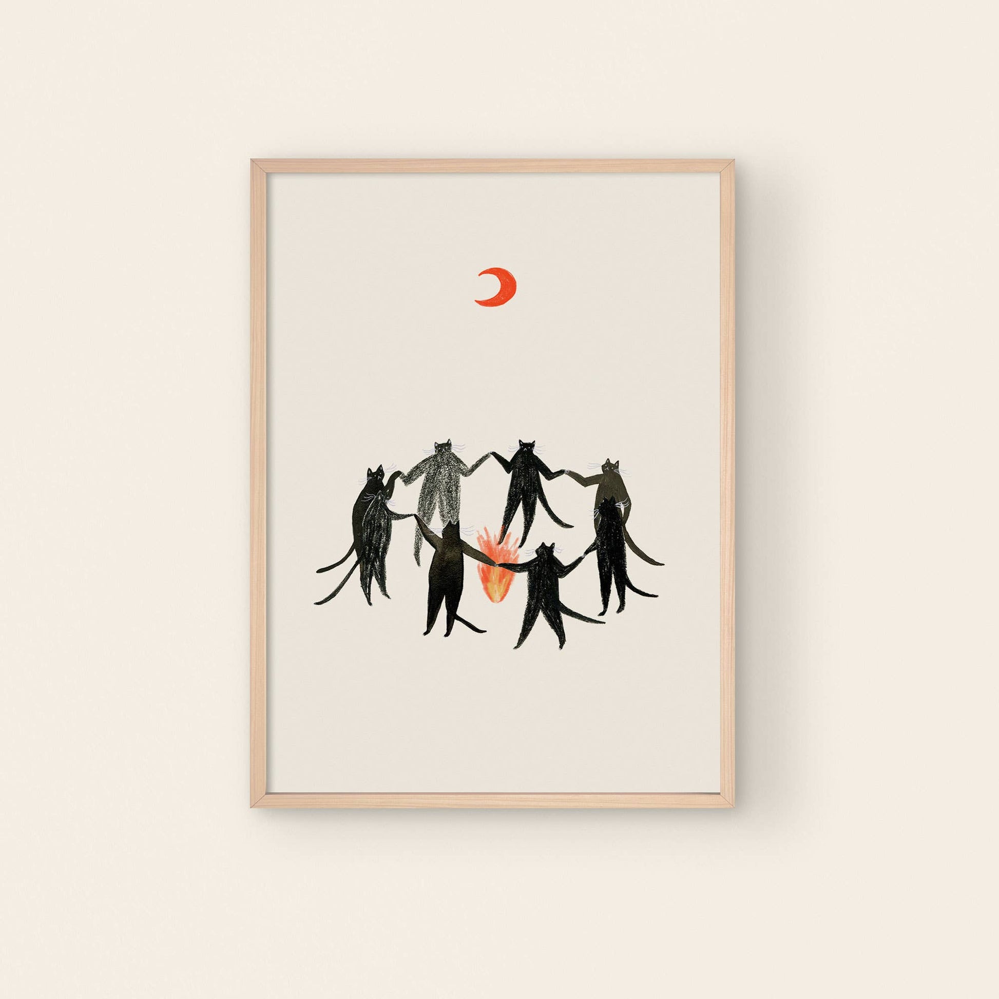 Under a blood red crescent moon, a clowder of cats hold paws in a summoning circle around a blazing fire. For good or for ill, the power of the mystic cats on this giclée print cannot be denied. This cat print makes a magical addition to any home decor, whether in a nursery, office or living space.