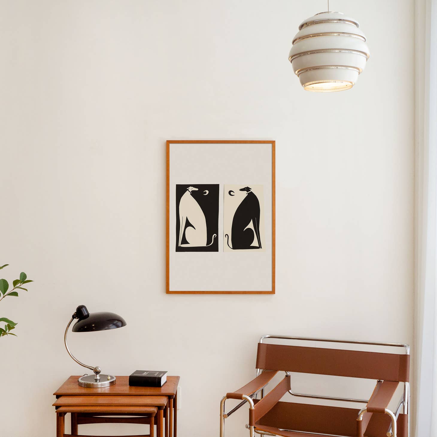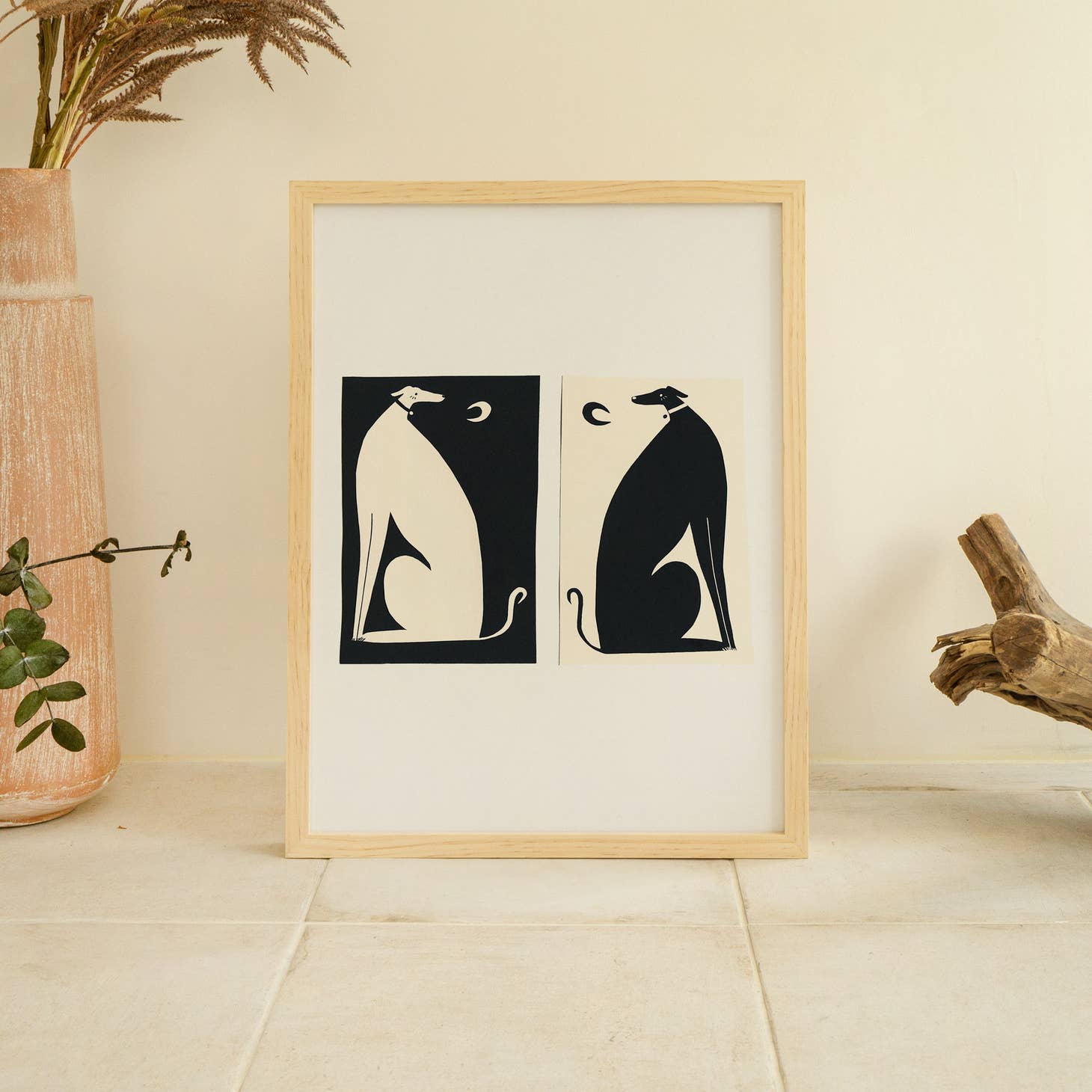 Two halves of a whole, a black dog and its inverse white dog share space on this whippet art print.