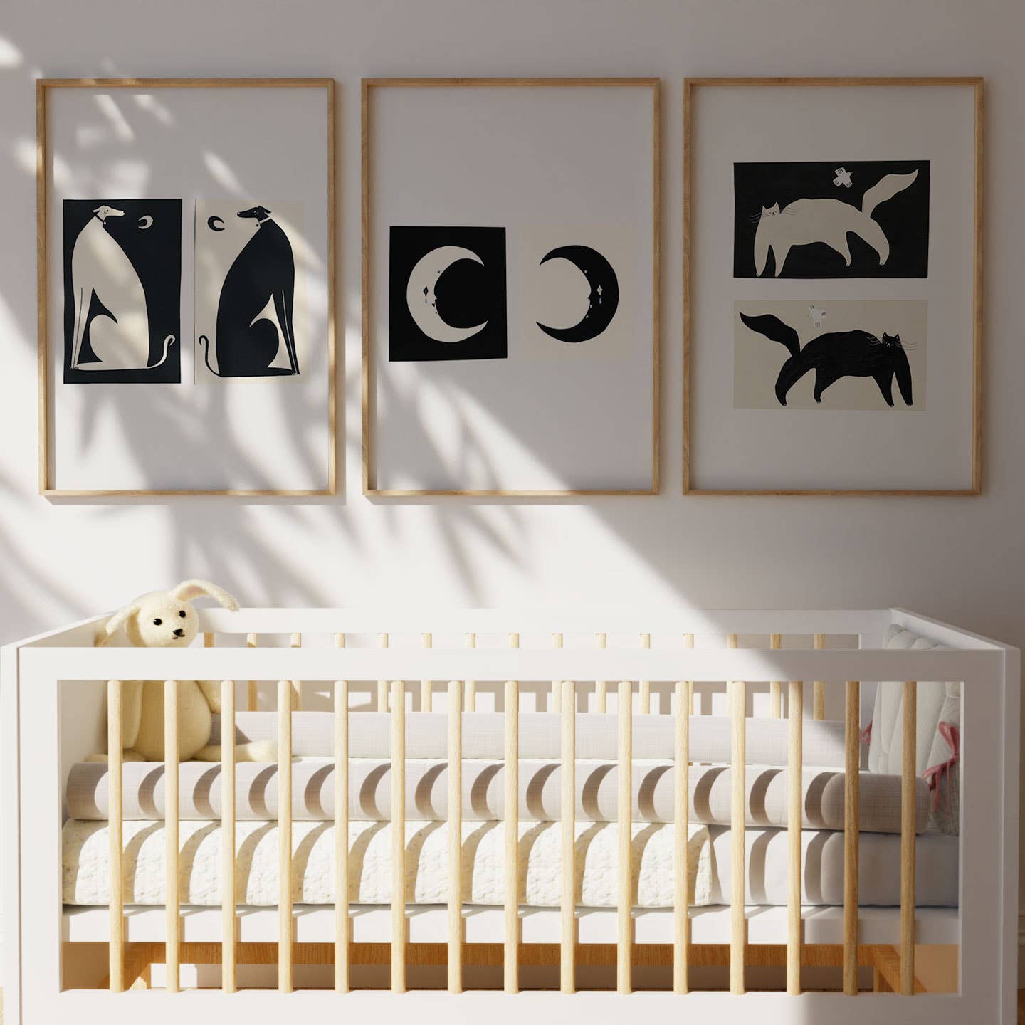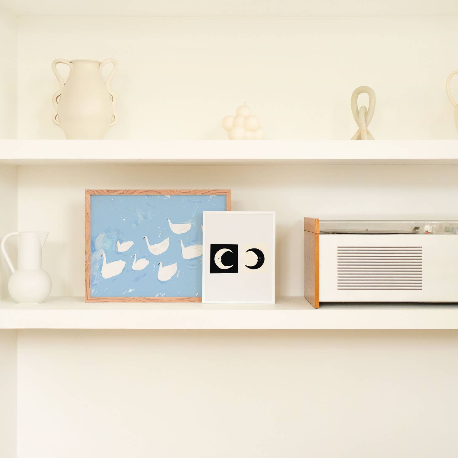 Calming and soft, two moons joined together, yin and yang on this delicate art print. A captivating piece from our popular Negative / Positive collection, these two crescent moons, one black, one white, have gentle faces and shed single tear - inspired by the famous sad black and white clown, Pierrot.