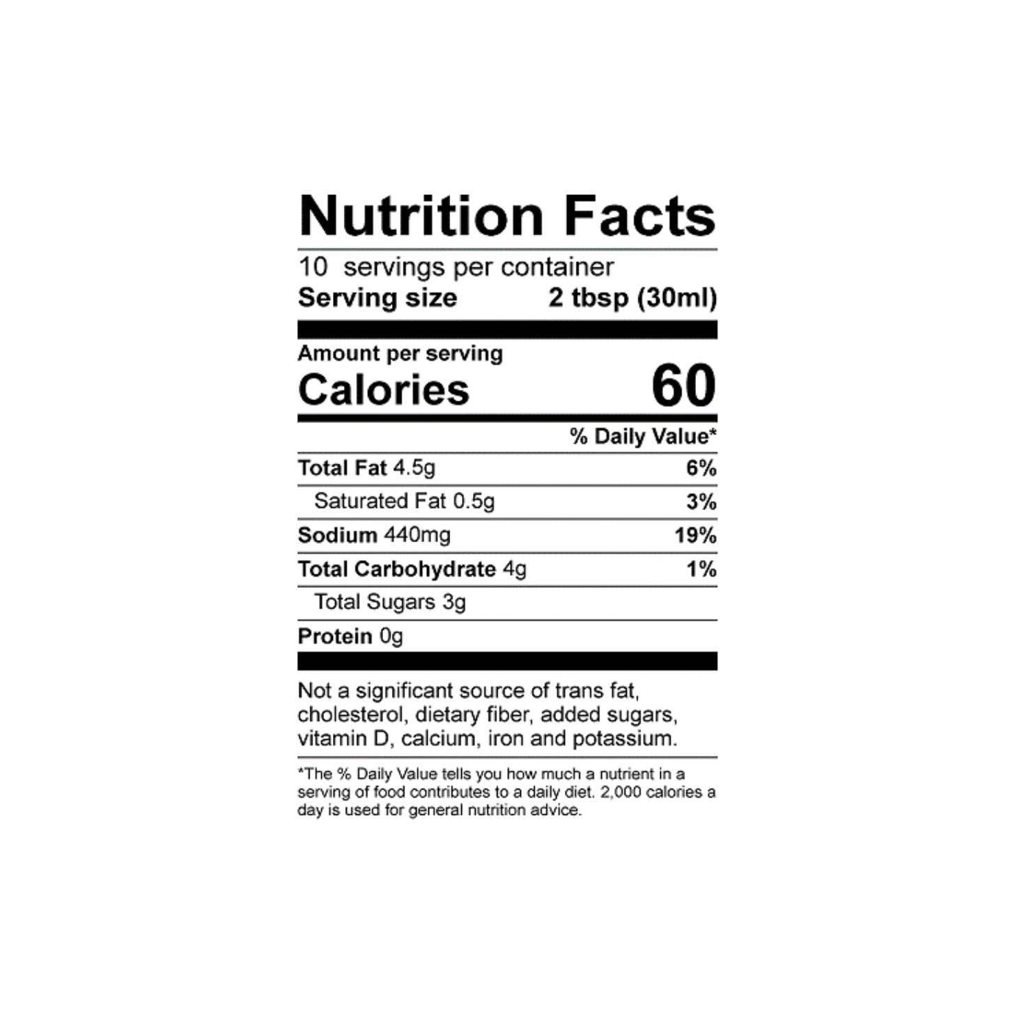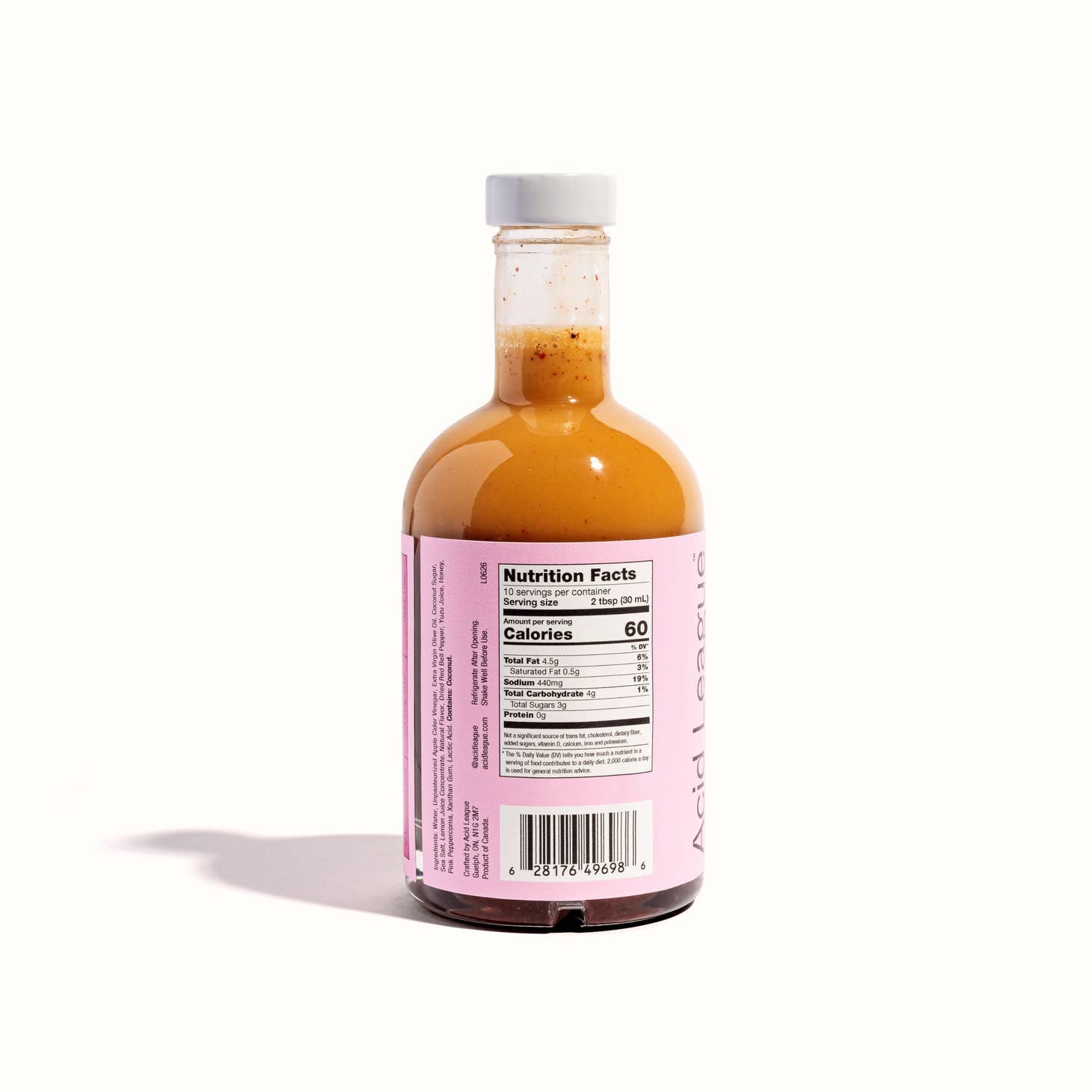 Ingredients: Water, Apple Cider Vinegar, Extra Virgin Olive Oil, Fair Trade Coconut Sugar, Sea Salt, Lemon Juice Concentrate, Natural Flavor, Dried Red Bell Pepper, Yuzu Juice, Honey, Pink Peppercorns, Xanthan Gum, Lactic Acid.