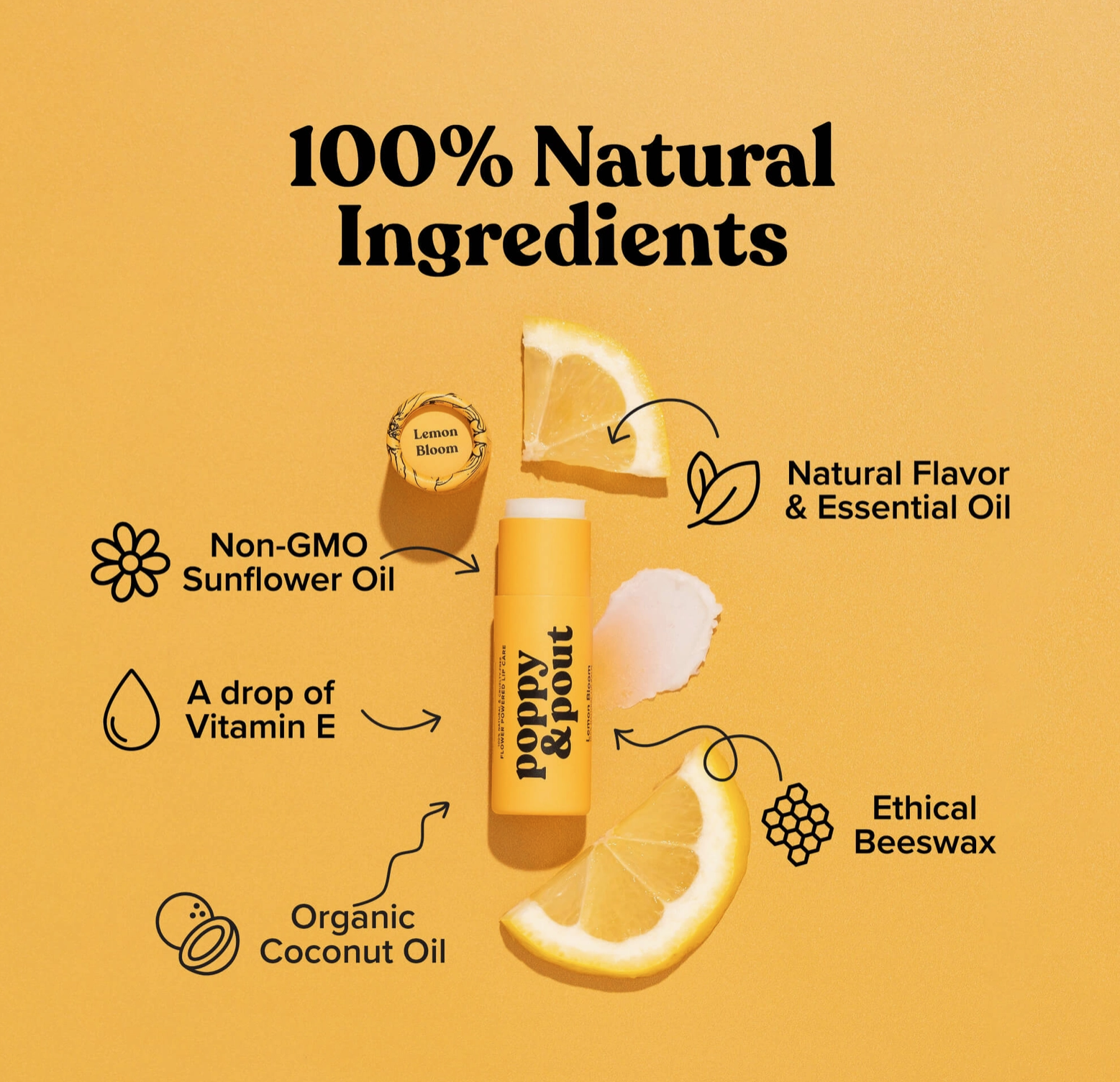 Poppy & Pout is the original flower-powered lip care brand, hand-crafting eco-friendly, hydrating lip balms for over a decade. Anyone who enjoys the scent or flavor of lemon will love our Lemon Bloom Lip Balm. It’s both refreshing and hydrating! Every Poppy & Pout lip balm is made with 100% natural ingredients and hand-poured into cardboard tubes.