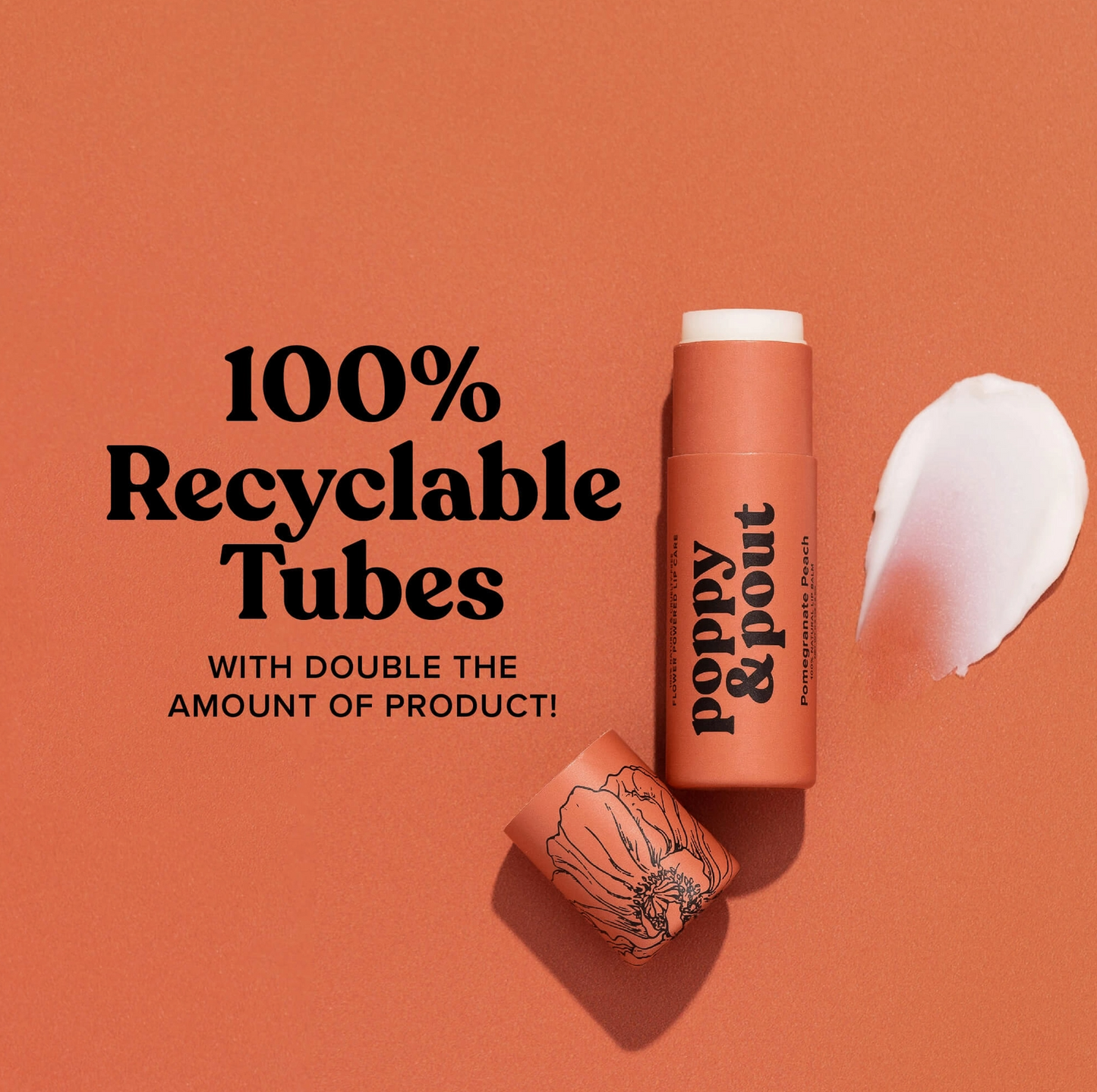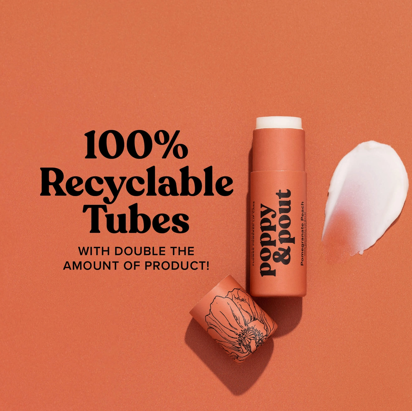 Poppy & Pout is the original flower-powered lip care brand, hand-crafting eco-friendly, hydrating lip balms for over a decade. Our Pomegranate Peach Lip Balm is just the right amount of sweet and fruity! Our loyal fans are OBSESSED with this new flavor combination. It's one of our best sellers for a reason! Every Poppy & Pout lip balm is made with 100% natural ingredients and hand-poured into cardboard tubes.