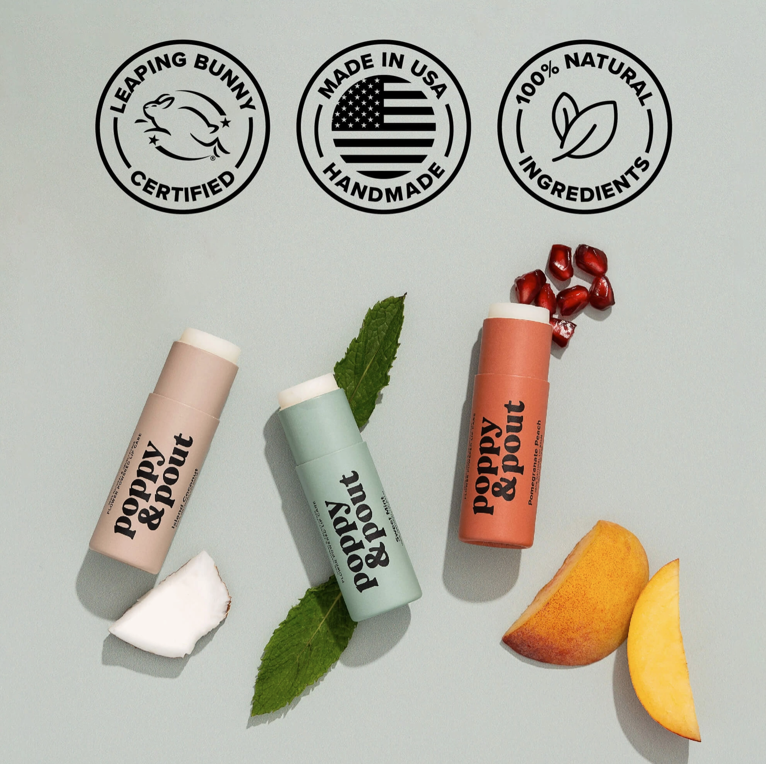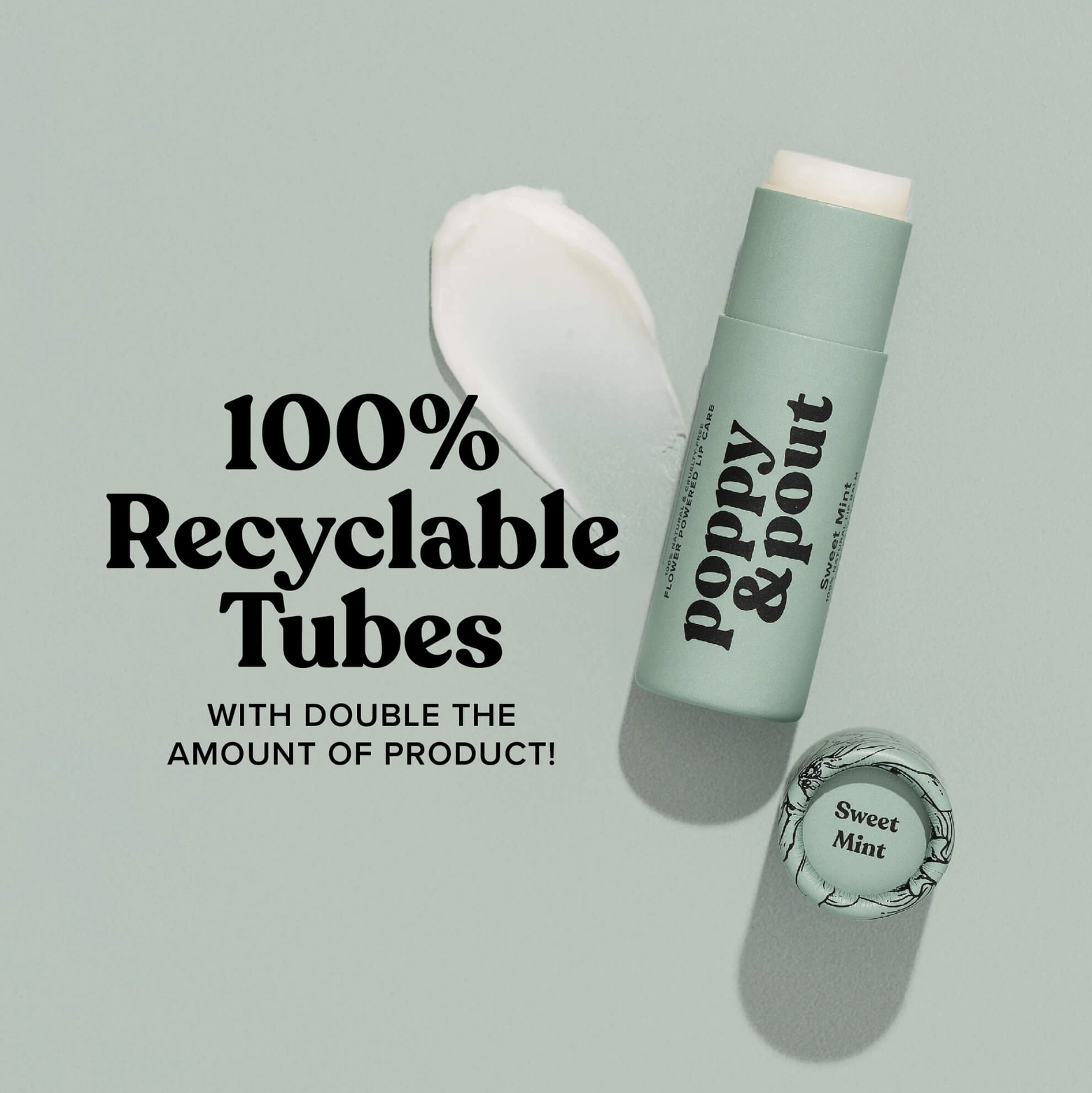 Poppy & Pout is the original flower-powered lip care brand, hand-crafting eco-friendly, hydrating lip balms for over a decade. Our first ever lip balm, Sweet Mint, has been our best seller since the very beginning! We’ve perfected our recipe, which results in a perfectly smooth and minty lip balm. Every Poppy & Pout lip balm is made with 100% natural ingredients and hand-poured into cardboard tubes.