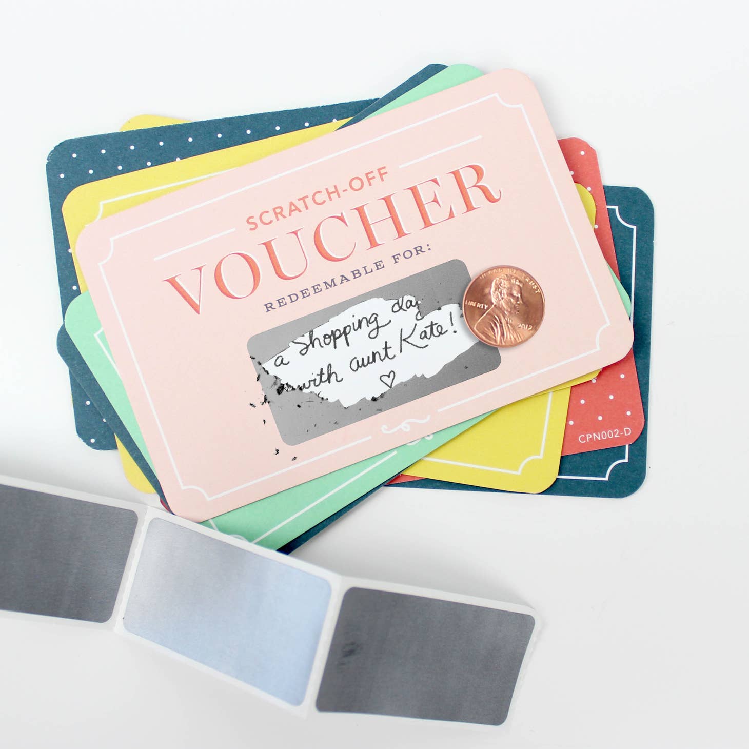 Make your own scratch-off vouchers! Hand write any message in the blank space, then cover it with the scratch-off sticker provided. Scratching with a coin will reveal your hidden prize! These are the perfect size to slip into a lunch bag or pocket! The sky's the limit on how you use these.